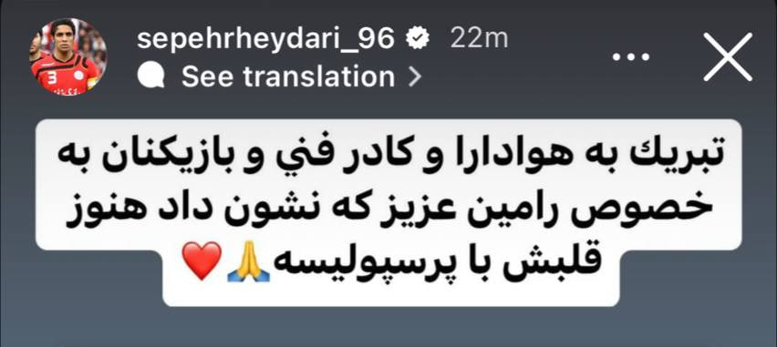 سپهر حیدری، یکی از بازیکنان پیشین پرسپولیس که میان هواداران از محبوبیت بالایی برخوردار است، با انتشار یک استوری در صفحه اینستاگرامی خود، برد را به هواداران و بازیکنان پرسپولیس و به طعنه به رامین رضاییان، تبریک گفت.