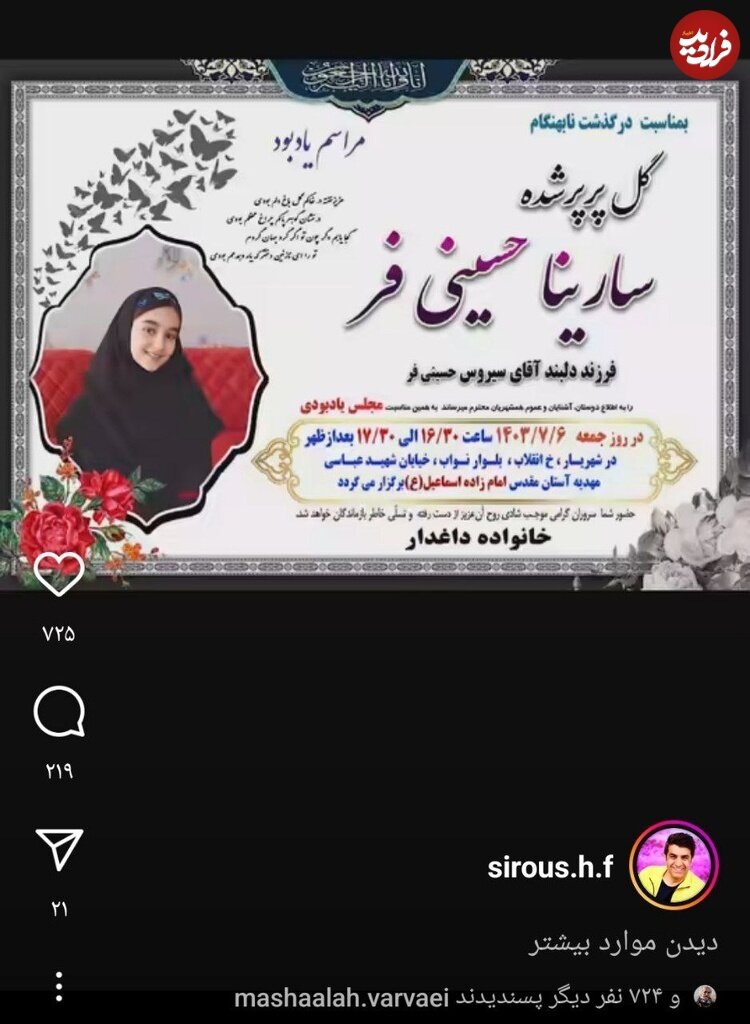 سیروس حسینی فر بازیگر نقش سیروس در سریال نون با انتشار یک تصویری در صفحه اینستاگرام اش خبر از درگذشت ناگهانی دخترش داده است. او درباره علت فوت فرزندش جزئیاتی منتشر نکرده است.