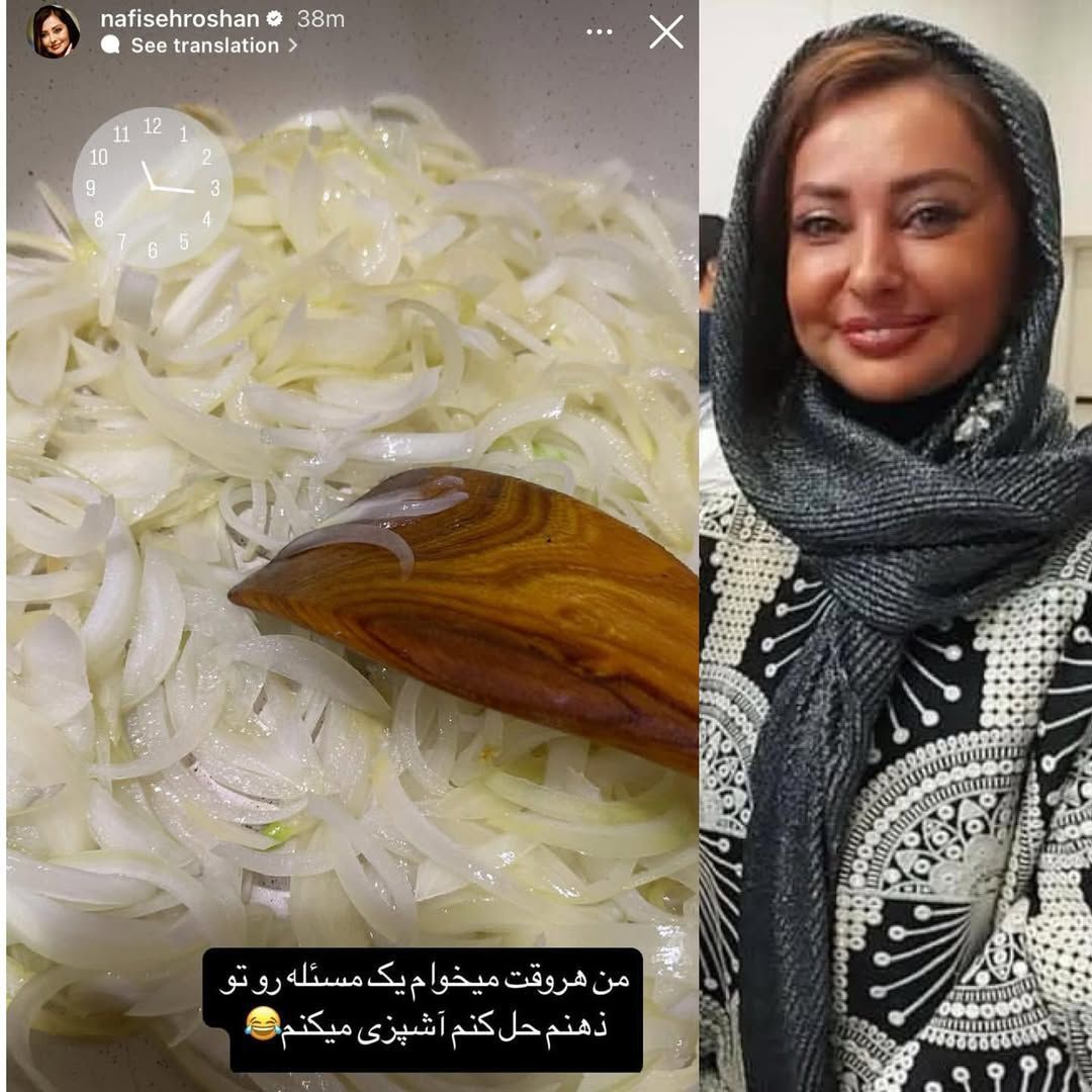وقتی خانم بازیگر نفیسه روشن میخواهد از آشپزی خود رونمایی کند سلفی جالب خانم بازیگر با پیاز داغ ه رنگ روی دیگهای دارد